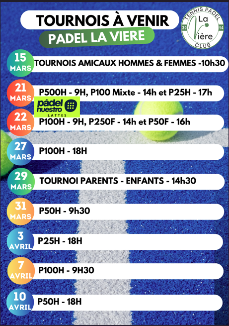 Nos tournois de Padel à venir ! Inscription sur notre application de réservation ou au 07.64.01.91.10 🙂